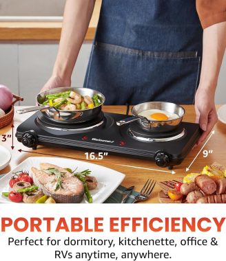 Elite Gourmet EDB-302BF# Countertop Double Cast Iron Burner, 1500 Watts Electric Hot Plate, Temperature Controls, Power Indicator Lights, Easy to Clean, Black